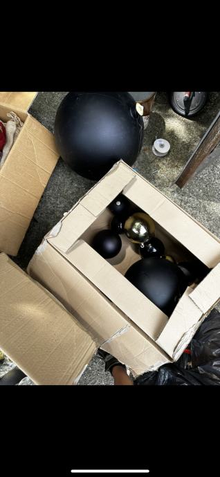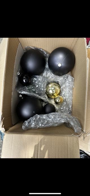 Prodajem dvije kutije crnih i zlatnih kuglica za bor. Nekoliko je velikih kugla koje mogu biti ili ukras na podu ili visiti iz stropa. U dobrom su stanju, nisu ostećene.
