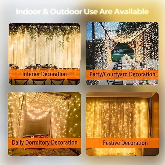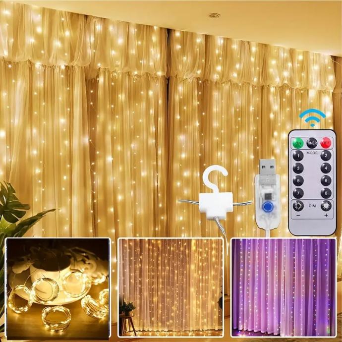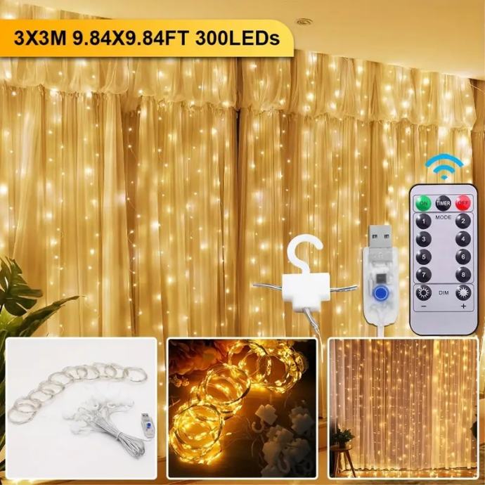 Topla bijela boja LED dimabilna svjetleća zavjesa 3 metra dužine i 3 metra širine, ukupno 300 LED dekorativnih lampica sa daljinskim(baterija uključena) i vješalicama za brzo jednostavno postavljanje.