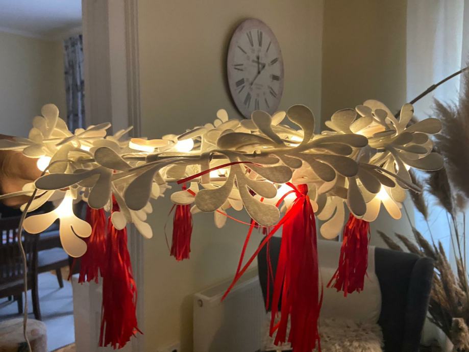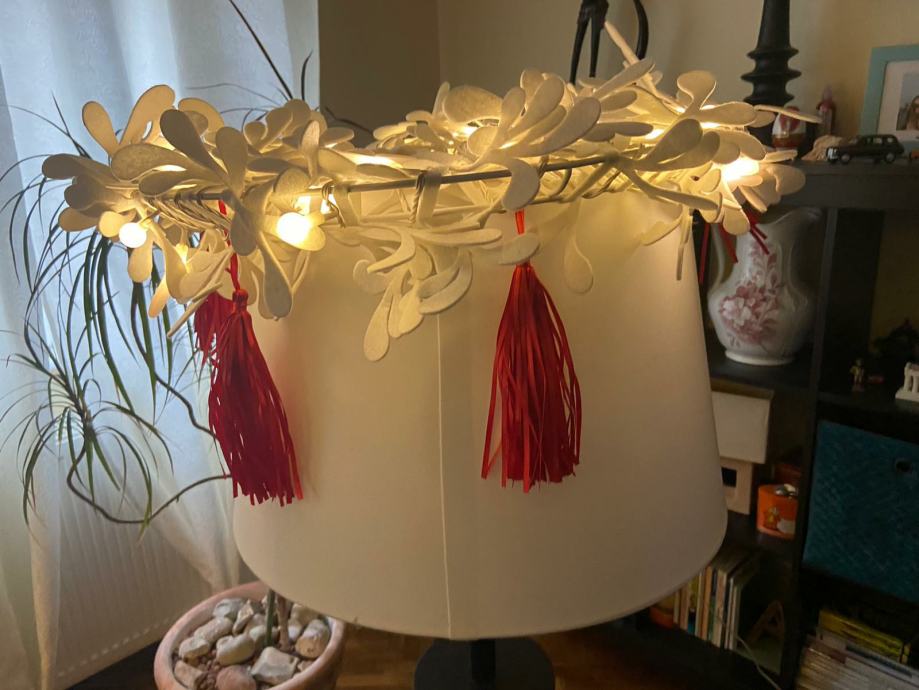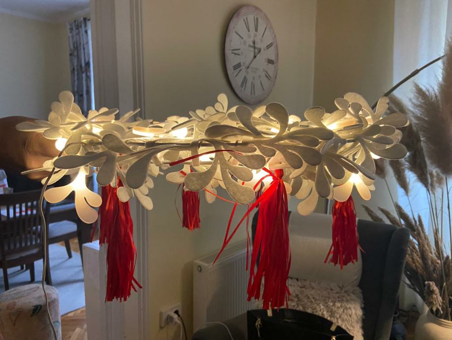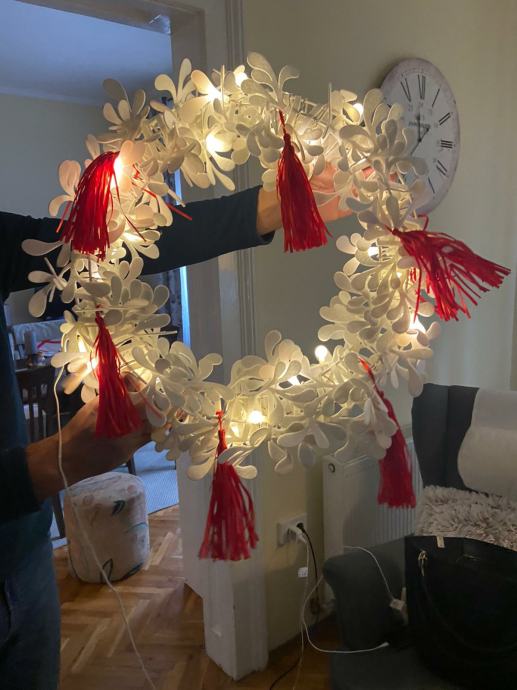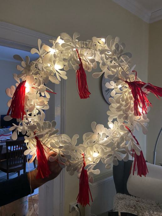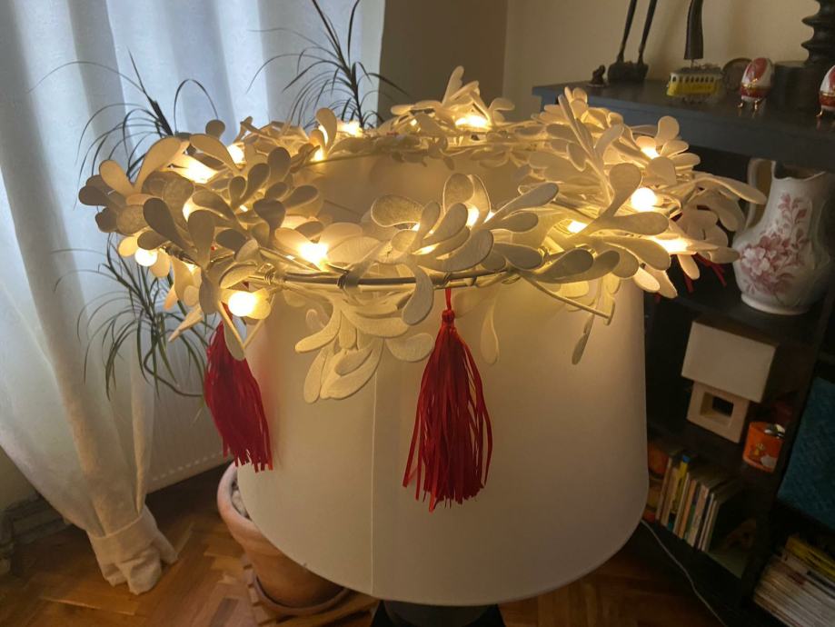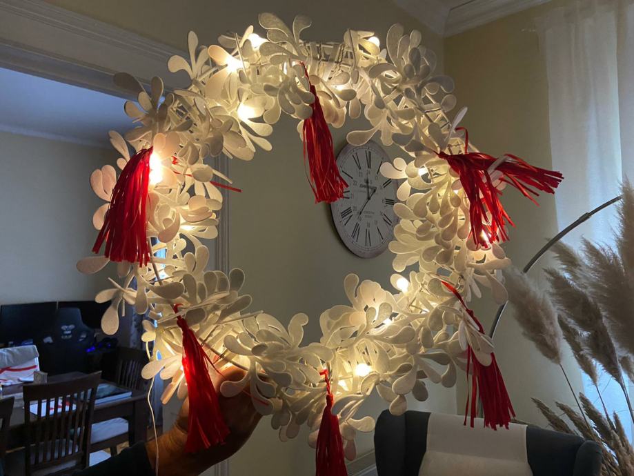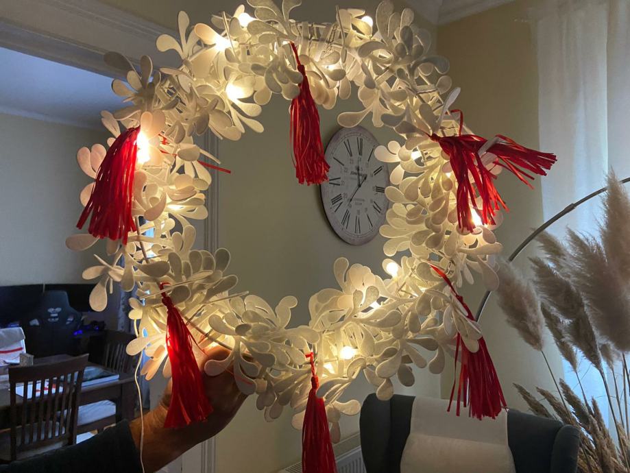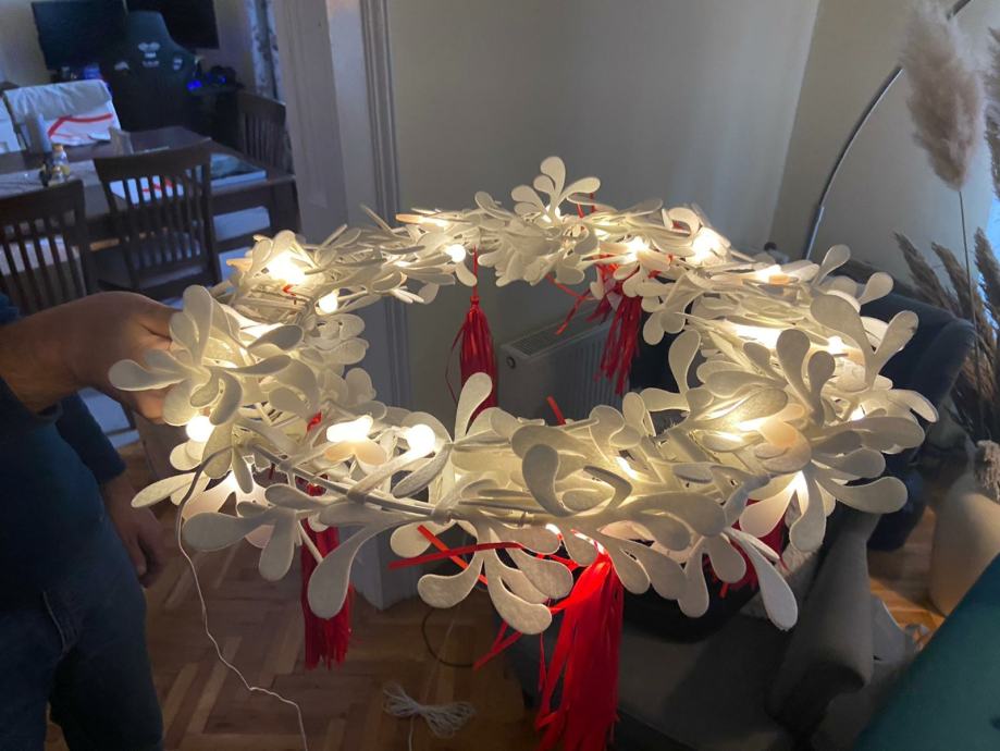 Bozicni vijenac, može se postaviti kao luster, moze ići na vrata ili na zid. Priključak na struju sa cca 5 m kabela.