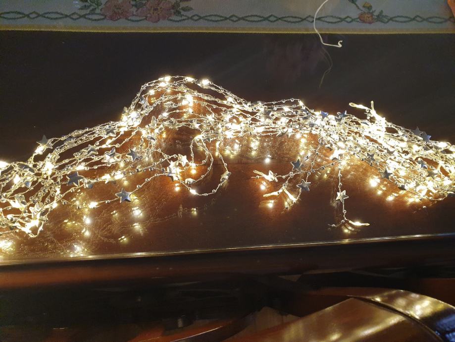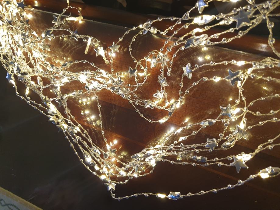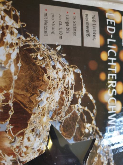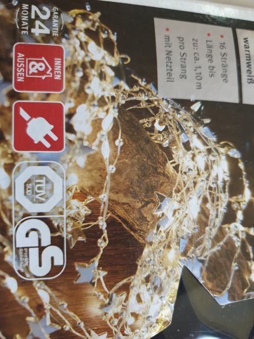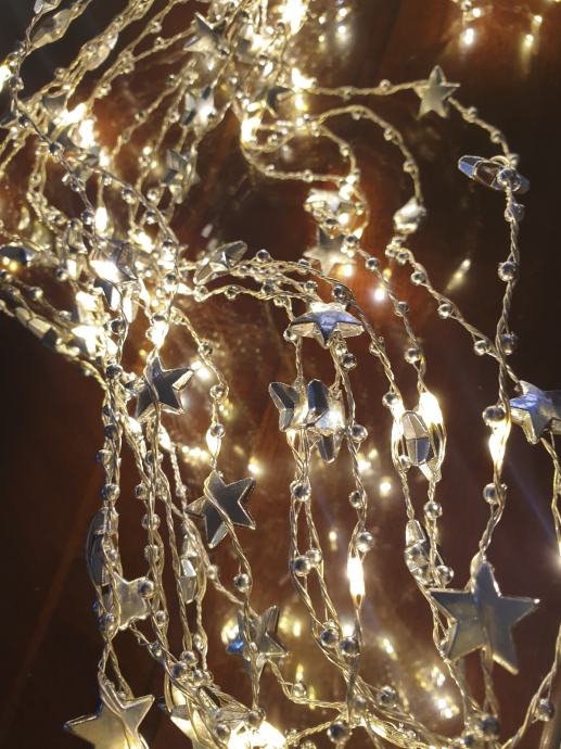 Prekrasne, specifične izuzetno kvalitetne Božićne lampice sa zvjezdicama i perlicama cca 16 nizova, cca 1,5 m svaki , posebnog dizajna, nizovi samostalno padaju od vrha bora ili drugog objekta, mogu se koristiti i za druge proslave, radi svečane iluminacije.
