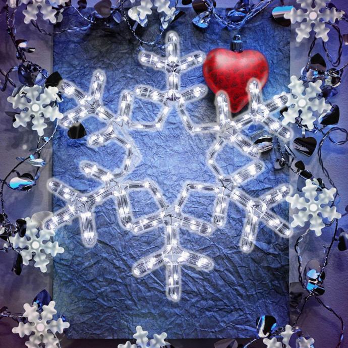 Svjetleći ukras u obliku pahulje snijega, crijevo s LED lampicama pričvršćeno na metalnu konstrukciju promjera 30-60 cm, radi na struju 220-230 V, žica bijele boje dužine cca 9-10 m, za unutarnju upotrebu.
