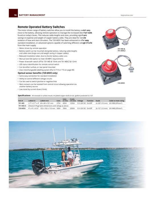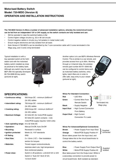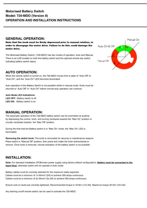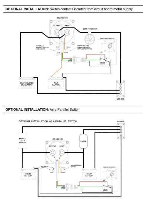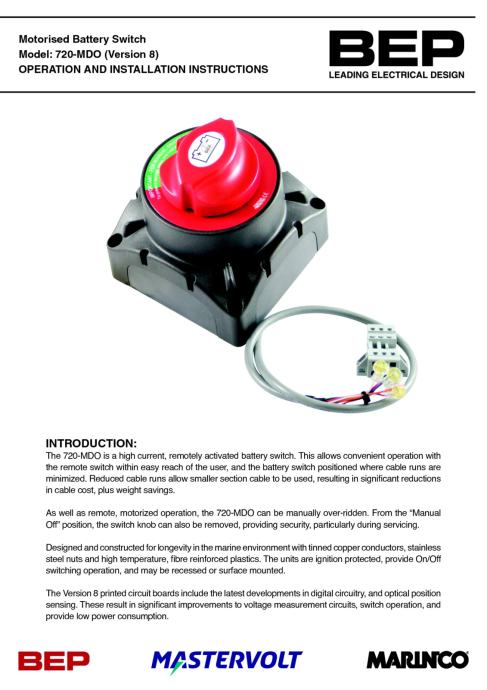 Sklopka 720-MDO je poboljšana, kako bi uz jednostavnu standardnu instalaciju, omogućila napredne opcije prebacivanje različitih naponskih krugova iz glavnog napajanja (na primjer: pramčani potisnik 48V / servis plovila 24V). Optički senzor, sa niskom potrošnjom struje u stanju pripravnosti (