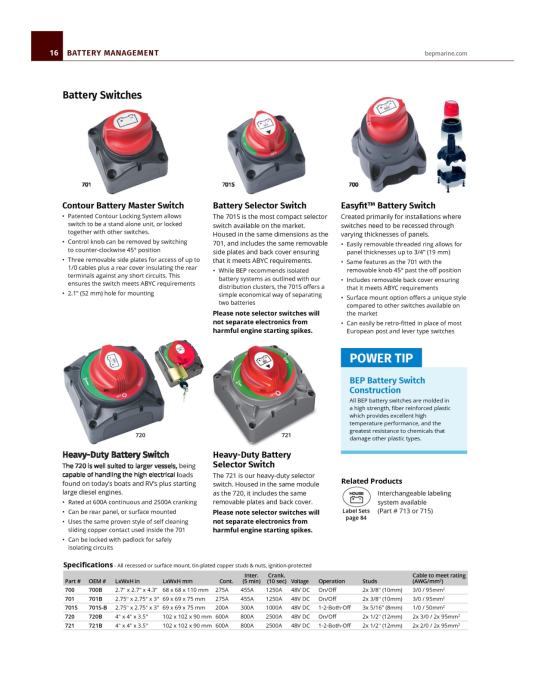 BEP MARINE 720 ON-OFF sklopka može podnjeti velika električna opterećenja i zato je prikladna za veća plovila/vozila, te za start njihovih motora. Moguća instalacija : na površinu i sa stražnje strane panela. Kontakti su klizni bakreni sa mehanizmom samočišćenja. Sklopka se može zaključati lokotom radi prevencije neovlaštenog korištenja. Stranice sklopke se mogu maknuti radi lakšeg dovoda i spajanja kabela.