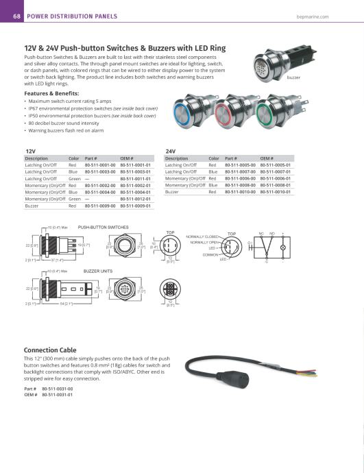 Kučišta BEP MARINE tastera izrađena su od nehrđajućeg čelika. Kontakti su od srebrne legure. Idealni su za montažu na kontrolne ploče. Prstenovi u boji (crveni, plavi, zeleni) mogu se spojiti kao prikaz napajanja sustava ili uključiti kao pozadinsko osvjetljenje. Linija proizvoda uključuje i zvučne signale upozorenja-alarme sa LED svjetlosnim prstenovima, te konekcijski kabel dužine 300mm za lakšu instalaciju na nedostupnim mjestima.