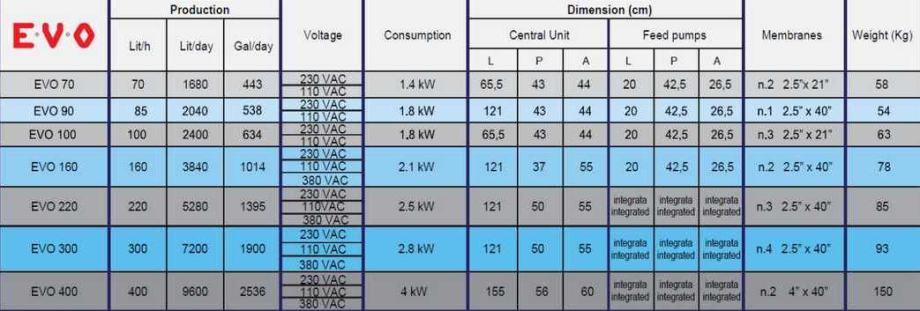 Automatski proizvođać vode posljednje generacije.Kontroler sa upravljanjem na dodir u boji. Opremljeni automatskim podešavanjem pritiska i automatskim sustavom ispiranja vodeni uređaji EVO linije mogu u potpunosti raditi i obavljati funkcije samoodržavanja bez potrebe operatera. Elektronska upravljačka jedinica povezana sa nadzornim sustavima putem RS 485 BUS protokola. Isporučuje se u monobloku ili u modularnoj izvedbi na okviru od nehrđajućeg čelika AISI 316 za jednostavnu ugradnju i maksimalnu pouzdanost u vremenu.