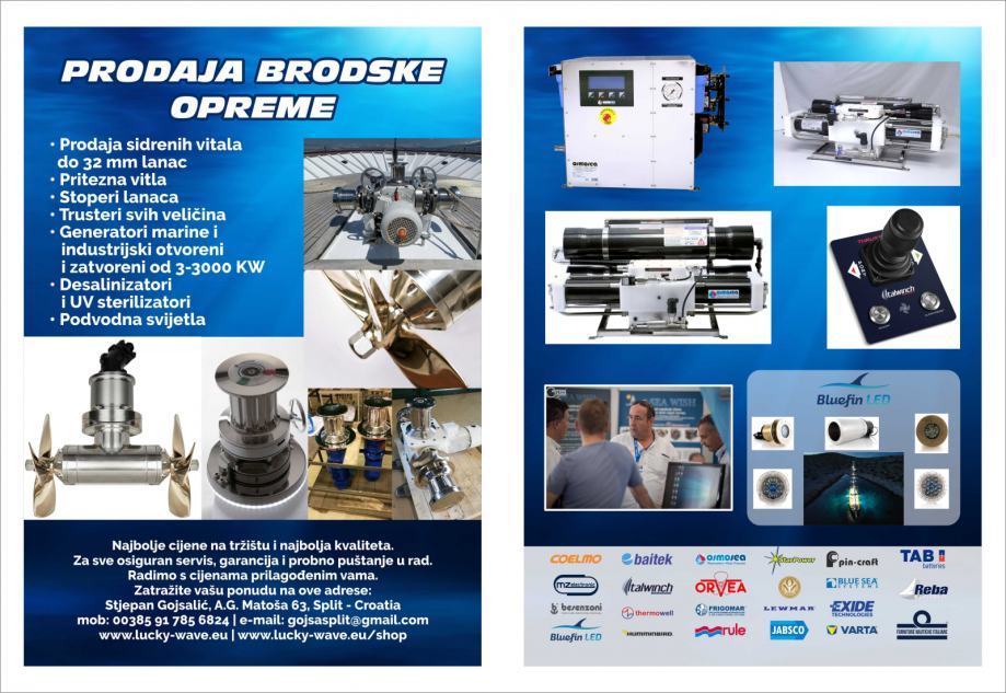 LUCKY WAVE specializes in nautical equipment, yacht and mega yacht service. Sales and representation of nautical equipment, dry marina services and winter maintenance, year-round maintenance with a contract. Complete care of your ships. Sales of all marine devices (gangways, cranes, air conditioners, refrigerators, generators, chargers, winches, bow thrusters…) with technical advice, secured installation for all equipment purchased from us. As representatives of many companies, we are customer-oriented in providing top quality and service.