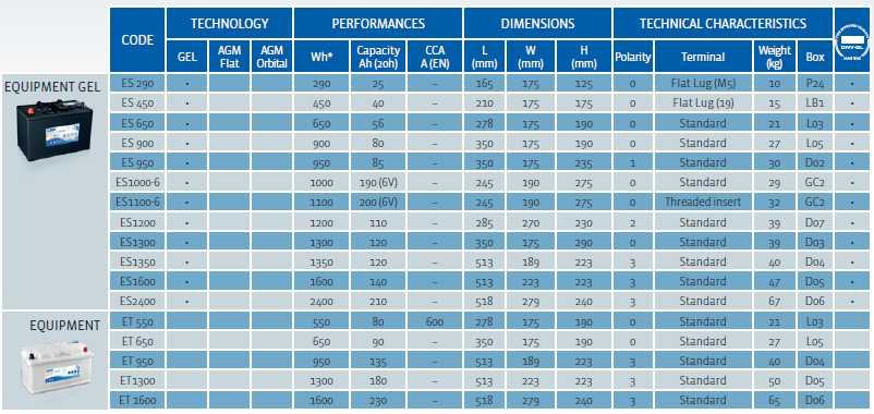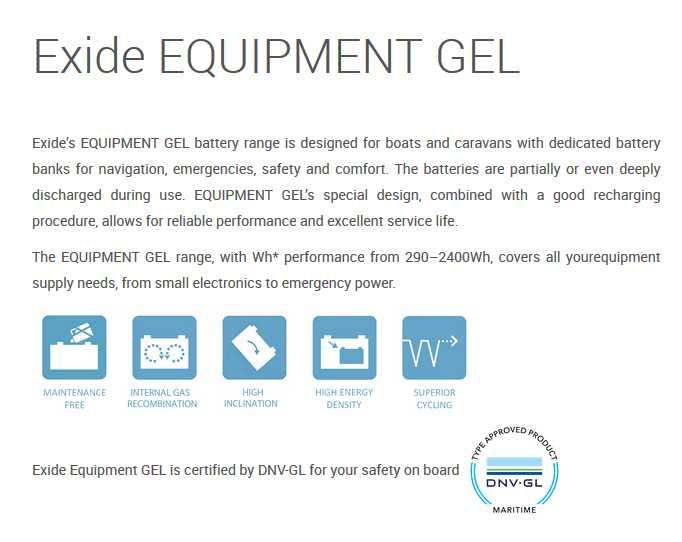 Exide's EQUIPMENT GEL asortiman baterija dizajniran je za brodove i kamp prikolice s namjenskim baterijama za navigaciju, hitne slučajeve, sigurnost i udobnost. Omogućavaju pouzdane performanse i izvrstan radni vijek.