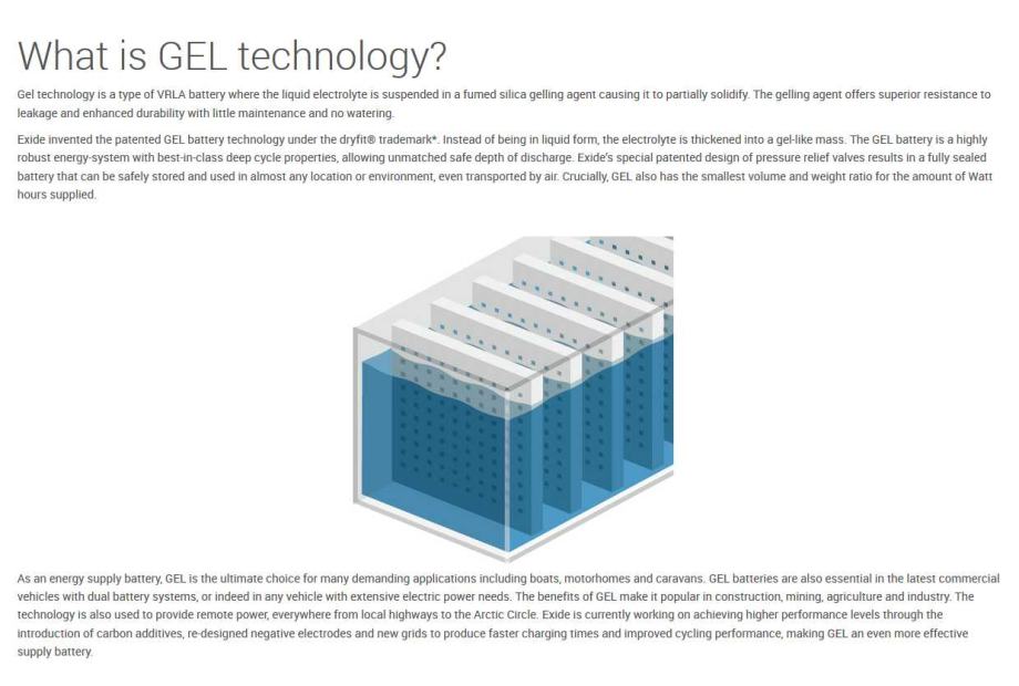 Gel tehnologija je vrsta VRLA baterije u kojoj se tekući elektrolit suspendira u uparenom silikatnom gelirajućem agentu što uzrokuje da se djelomično ukruti. Sredstvo za geliranje nudi vrhunsku otpornost na propuštanje i povećanu izdržljivost uz malo održavanja i bez zalijevanja. Exide je izumio patentiranu GEL tehnologiju baterija pod zaštitnim znakom dryfit® *. Umjesto u tekućem obliku, elektrolit se zgušnjava u masu sličnu gelu. GEL baterija izuzetno je robustan energetski sustav s najboljim svojstvima dubokog ciklusa u svojoj klasi, omogućava neusporedivu sigurnu dubinu pražnjenja. Exideov poseban patentirani dizajn ventila za smanjenje tlaka rezultira u potpunosti zabrtvljenom baterijom koja se može sigurno pohraniti i koristiti na gotovo bilo kojem mjestu ili u okruženju, čak i ako se transportira zrakom. Ono što je najvažnije, GEL također ima najmanji omjer volumena i mase za isporučenu količinu Watt sati.