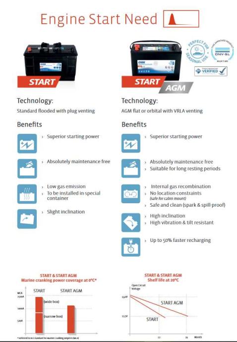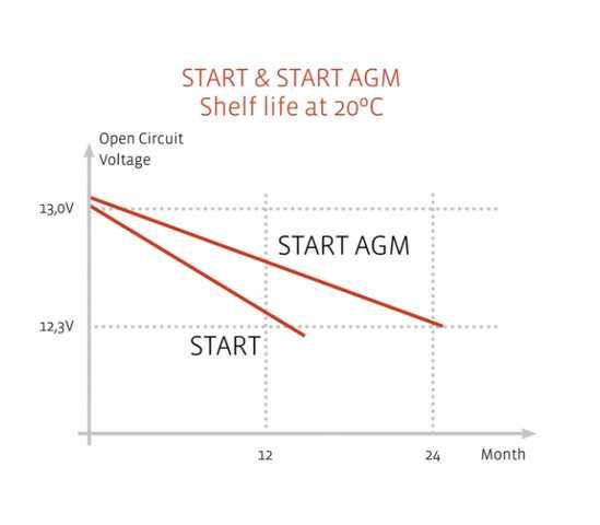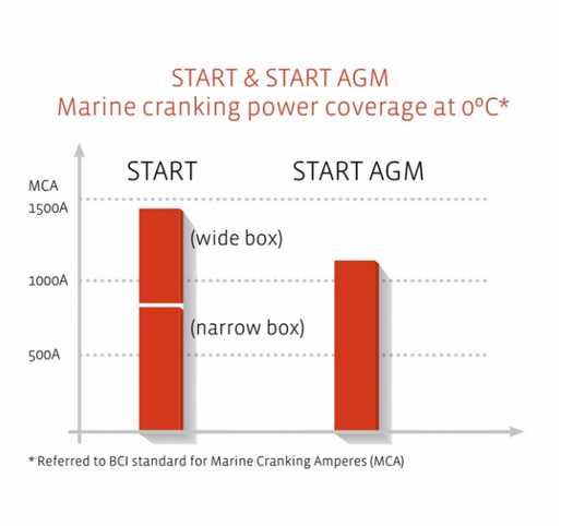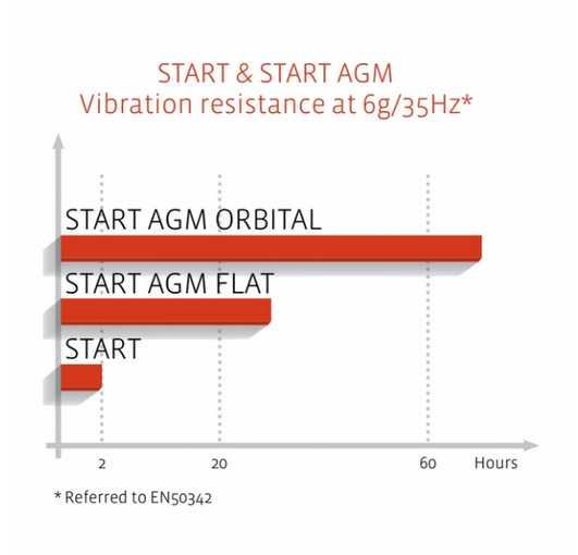 Umjesto uobičajenog polietilenskog separatora, pločice AGM baterija obložene su staklenom prostirkom koja apsorbira elektrolit i održava izravan kontakt s aktivnim materijalom ploče. To uvelike povećava učinkovitost pražnjenja i punjenja, što rezultira visokim performansama pokretanja motora i mogućnostima visokog ciklusa. Fizička veza između komponenata baterije i spremnika čini AGM otpornim na prolijevanje i najotporniju bateriju na vibracije i naginjanje pri velikim nagibima.