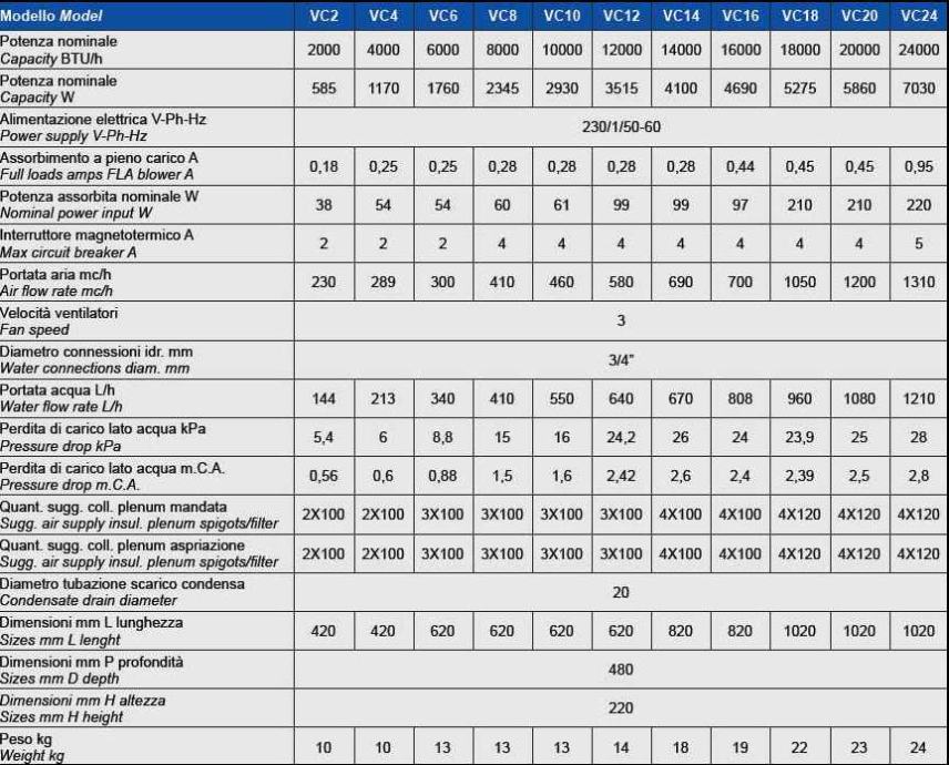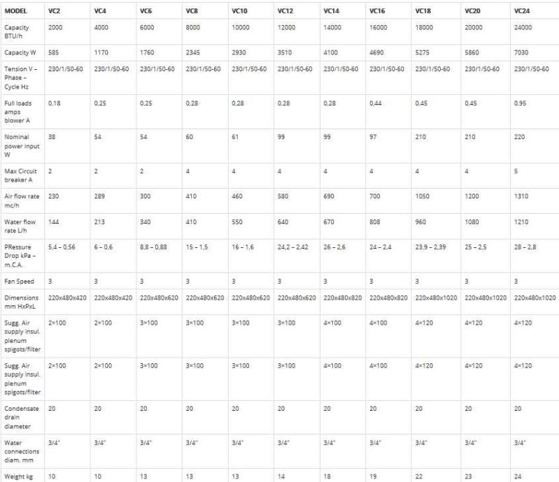 VC se uglavnom sastoje od sljedećih komponenti: rebrasti svitak (izmjenjivač topline voda / zrak), visokotlačni centrifugalni ventilator (i) opremljen motorom visokog stupnja učinkovitosti, duboka posuda za odvod nehrđajućeg čelika opremljena s dvije rupe za ispuštanje odvoda, ventil za odzračivanje, ulaz svježe vode priključak i izlaz. Dostupno u 11 veličina u rasponu od 2.000 do 24.000 BTU/h.