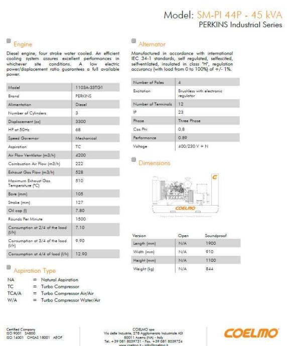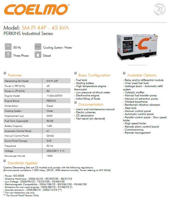 Electrical interruptions have become more frequent than in the past due to climatic factors and mains network overloads. Protect your belongings and your work with the Coelmo Generating Set that covers a range from 9 to 45 kVA designed for residential and commercial applications, that are equipped with “easy to operate” interfaces, have a reduced size and are extremely silent.