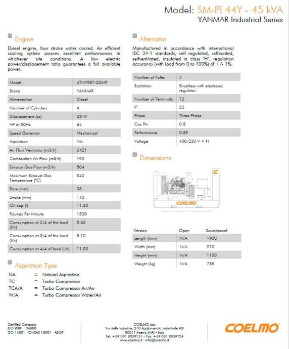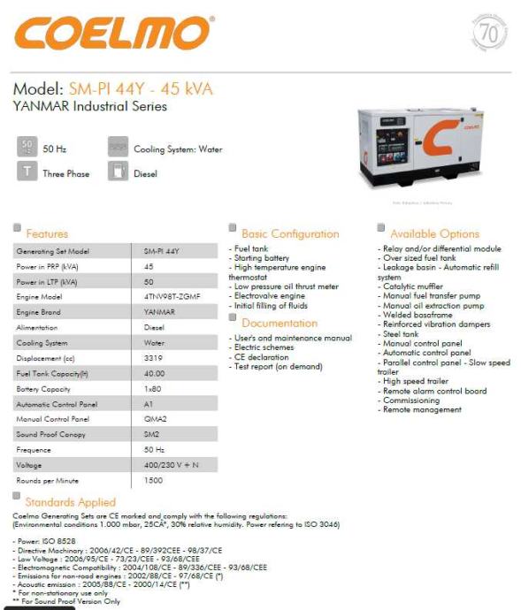 Electrical interruptions have become more frequent than in the past due to climatic factors and mains network overloads. Protect your belongings and your work with the Coelmo Generating Set that covers a range from 9 to 45 kVA designed for residential and commercial applications, that are equipped with “easy to operate” interfaces, have a reduced size and are extremely silent.