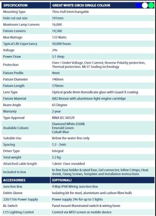 Veliko bijelo podvodno LED svjetlo GW20 proizvodi 14.500 lumena učvršćenja i ima gotovo neograničene mogućnosti ugradnje zahvaljujući ultra-niskom profilu okvira (4 mm) i unutarnjem sustavu pokretača.