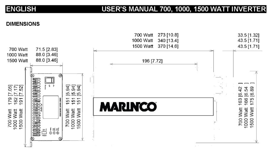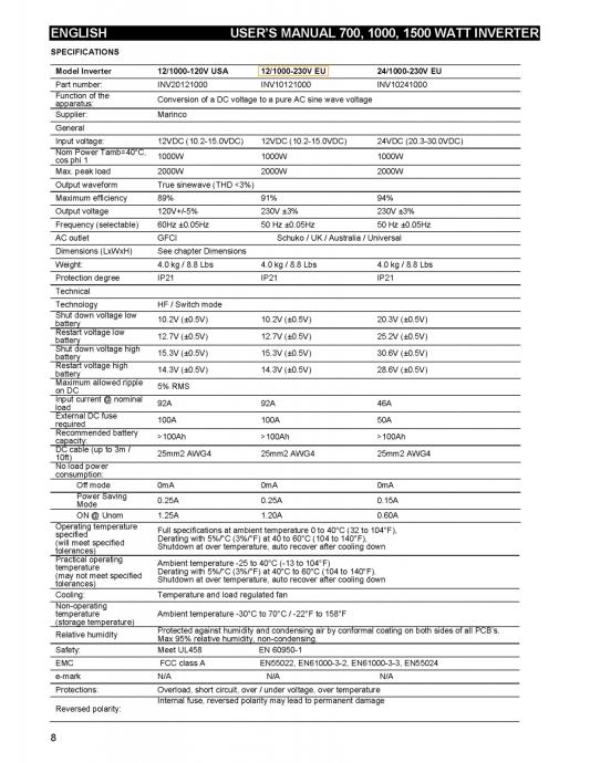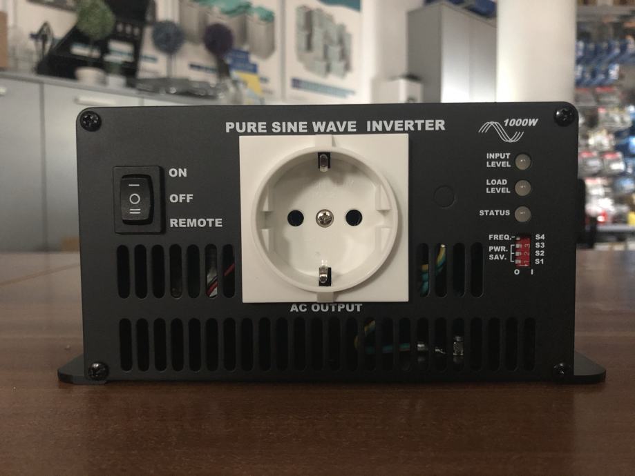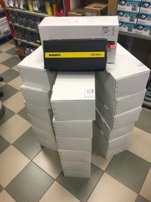 Inverter ulaznog napona 12V sa čistim sinusnim 230VAC izlazom snage 1000 W. Pogodan za napajanje osjetljivih električnih/elektroničkih uređaja na plovilu kao što su monitori, televizori, multimedija i sl. Uređaj ima ugrađenu zaštitu od neadekvatnog napona, obrnutog polariteta, prekomjernog zagrijavanja, te alarm ispražnjenosti baterije. Dimenzije : 383,5 x 166 x 88 mm (dxšxv). Zaštita IP21.