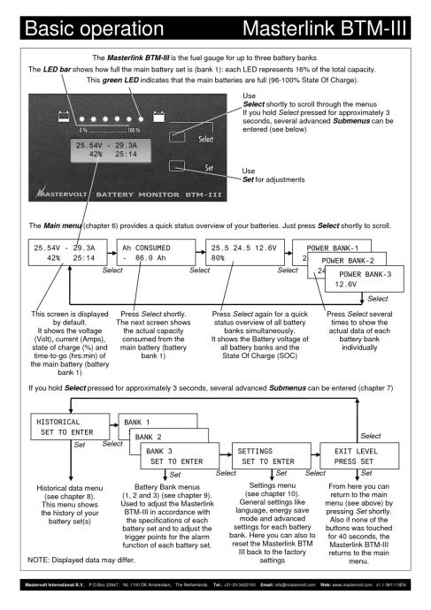 Mastervolt Masterlink BTM III staje na kraj neugodnim iznenađenjima, kao što su prazne baterije na plovilu. Ovaj monitor baterije (informacijski panel + šant) pruža točnu indikaciju struje, napona, preostalog vremena i preostalog kapaciteta baterijske grupe 1, te trenutnog i procijenjenog kapaciteta baterijskih grupa 2 i 3. Ugrađeni mikroprocesor izračunava preostali kapacitet i pohranjuje povijesne podatke. Baterijski monitori sa funkcijom zapisa povijest baterije postali su standardni garancijski zahtjev renomiranih proizvođača baterija. U praksi se pokazalo da vlasnici, koji na plovilu imaju instalirani monitor, pravilno koriste i održavaju svoje baterije, te im na taj način znatno produžuju životni vijek.