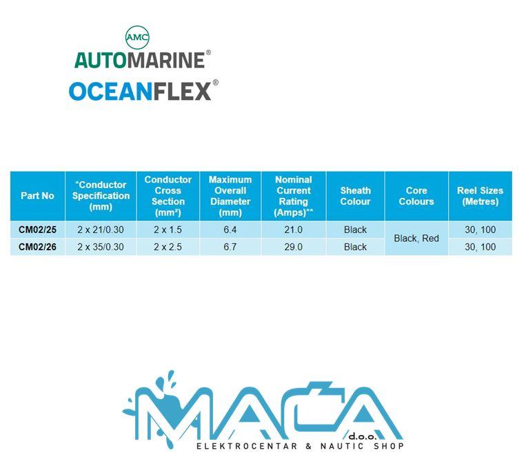 Ovi dvožilni i trožilni pokositreni kabel brenda OCEANFLEX dizajniran je za upotrebu u pomorskoj i automobilskoj industriji. Obilježje OCEANFLEX kablova je odlična otpornost na koroziju, benzin, dizel, ulja i razrijeđene kiseline. Također njihova PVC izolacija pruža izuzetnu otpornost na abraziju i rezove. Svi kablovi su proizvedeni u suglasnosti s ISO standardima, te su prikladni za 12V i 24V sustav.