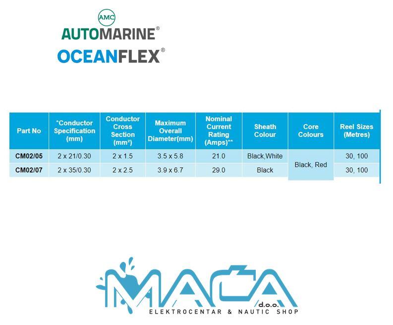 Ovi dvožilni i trožilni pokositreni kabel brenda OCEANFLEX dizajniran je za upotrebu u pomorskoj i automobilskoj industriji. Obilježje OCEANFLEX kablova je odlična otpornost na koroziju, benzin, dizel, ulja i razrijeđene kiseline. Također njihova PVC izolacija pruža izuzetnu otpornost na abraziju i rezove. Svi kablovi su proizvedeni u suglasnosti s ISO standardima, te su prikladni za 12V i 24V sustav.