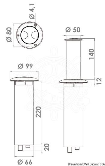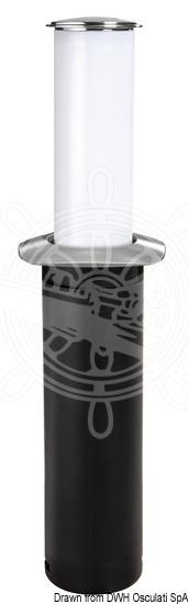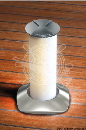 Kad se ne koristi je u ravnini s površinom stola. Jednim laganim okretanjem gornje inox pločice svjetlo se podigne i automatski se uključi. Dimmer optional (13.448.01) radi smanjivanja svjetla na efekt "ambijentne rasvjete". Gornji dio od sjajnog inoxa.