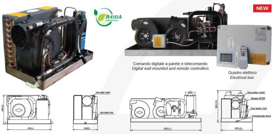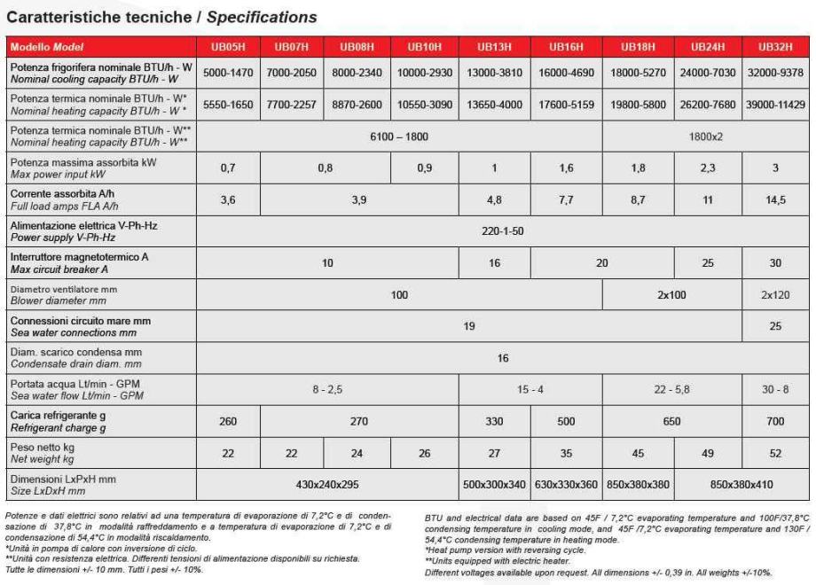 UB je linija vlastitih morskih klima uređaja s izravnom ekspanzijom i kondenziranom morskom vodom, idealna za hlađenje / grijanje jedne ili više susjednih kabina u malim / srednjim plovilima (8-18 m). UB-ovi su dostupni u 7 veličina, od 7.000 do 24.000 BTU / h rashladne snage, u verziji samo hlađenja, verziji toplinske pumpe s obrnutim ciklusom, a također su opremljeni i električnim grijačem. UB serija ima izuzetno lagan i kompaktan dizajn za jednostavnu instalaciju i servis. Sve komponente (kompresori i puhala visoke učinkovitosti i bez buke, korozijski kondenzatori od bakra-nikla, prekidači visokog i niskog tlaka) sastavljeni su na 100% kućištu od nehrđajućeg čelika što osigurava dug životni vijek i prikupljanje velike količine kondenzata.