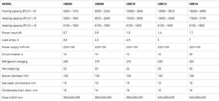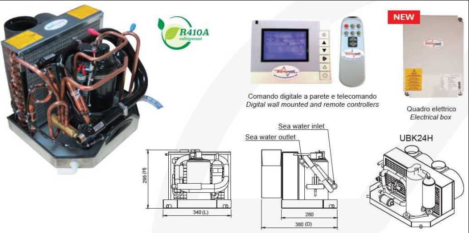 UBK je linija brodskih klima uređaja s izravnim širenjem i kondenziranom morskom vodom, idealna za hlađenje / grijanje jedne ili više susjednih kabina u mala / srednja plovila (8-14 m). UBK su dostupni u 5 veličina, od 5.000 do tp 16.000 BTU / h rashladne snage, u verziji samo hlađenja, verziji toplinske pumpe s obrnutim ciklusom, a također su opremljeni električnim grijačem. UBK serija ima izuzetno lagan i kompaktan dizajn za jednostavnu instalaciju i servis. Sve komponente (kompresori i puhala visoke učinkovitosti i bez buke, korozijski kondenzatori od bakra-nikla, prekidači visokog i niskog tlaka) sastavljeni su na 100% kućištu od nehrđajućeg čelika što osigurava dug životni vijek i prikupljanje velike količine kondenzata.