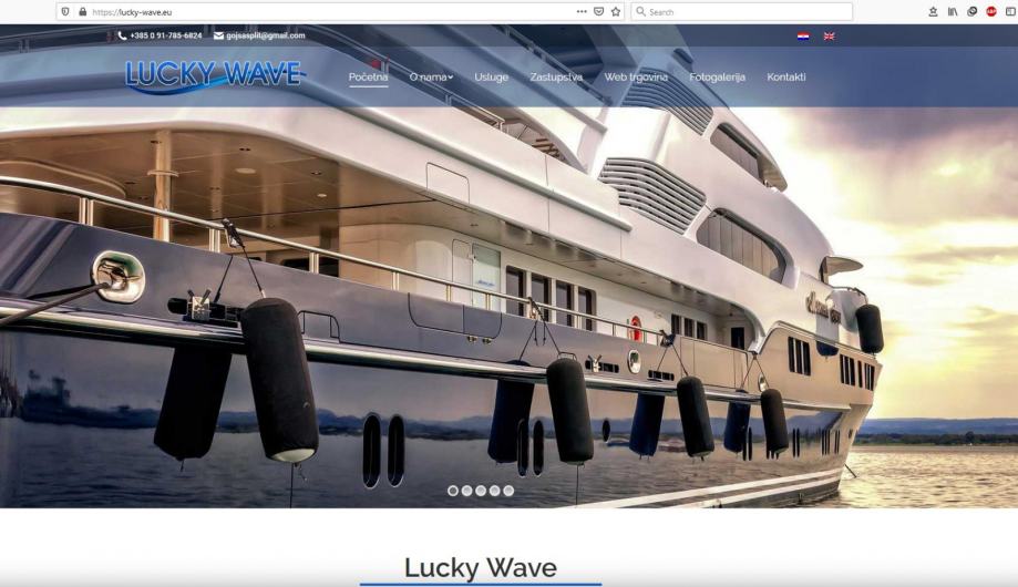 LUCKY WAVE specijalizirana trgovina nautičke opreme, servis jahti i mega jahti. Prodaja i zastupstvo nautičke opreme, usluge suhe marine te zimska održavanja, cijelogodišnja održavanja uz ugovor. Kompletna briga oko vaših brodova. Prodaja svih brodskih uređaja (passarele , dizalice , klime ,frižideri , generatori, punjači, vinčevi , bow thrusteri …) uz tehnički savjet, osigurana ugradnja za svu opremu kupljenu kod nas. Kao zastupnici brojnih tvrtki, usmjereni smo ka kupcu u pružanju vrhunske kvalitete i usluge.