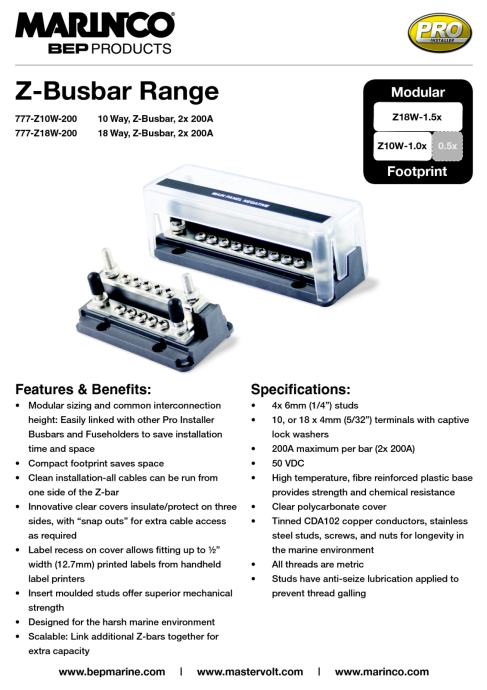 Patentirane Pro installer Z-sabirnice, koje štede prostor, predstavljaju potpuno je novi koncept razvoda brodskih kabela. Nudeći gotovo neograničenu fleksibilnost instalacije, sabirne šipke sa vijcima različitih razina mogu se spojiti zajedno Z-Link-om ili koristiti kao zasebna pozitivno/negativna sabirna mjesta. Pro Installer Z-sabirnice dostupne su u modelima od 10 i 18 vijaka, sa maksimalnom strujom od 200A. Proizvod se putem linkova može spajati sa drugima Pro installer proizvodima (sklopke, sabirnice, nosači osigurača ANL & T-oblika, izolirana mjesta i dr…).