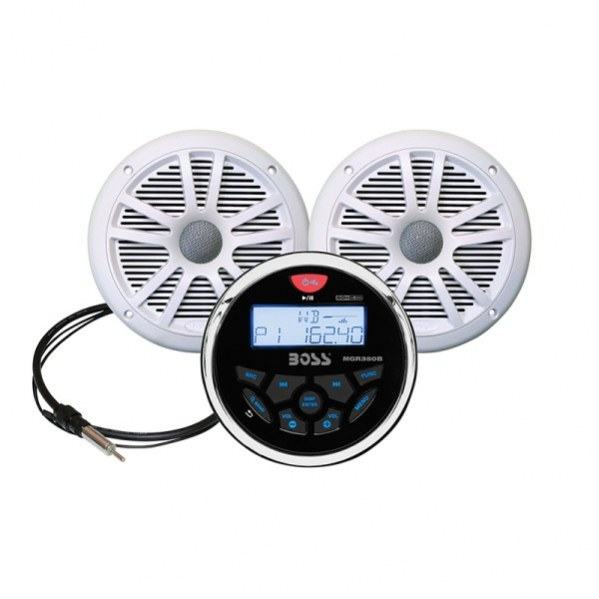 Marine radio + 2 6,5″ 180 W Dual Cone Marine bijeli zvučnici s polikarbonskim kućištem i gumenim okvirom + MRANT10 antena