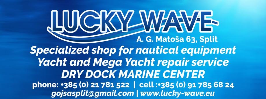 LUCKY WAVE specijalizirana trgovina nautičke opreme, servis jahti i mega jahti. Prodaja i zastupstvo nautičke opreme, usluge suhe marine te zimska održavanja, cijelogodišnja održavanja uz ugovor. Kompletna briga oko vaših brodova. Prodaja svih brodskih uređaja (passarele , dizalice , klime ,frižideri , generatori, punjači, vinčevi , bow thrusteri …) uz tehnički savjet, osigurana ugradnja za svu opremu kupljenu kod nas. Kao zastupnici brojnih tvrtki, usmjereni smo ka kupcu u pružanju vrhunske kvalitete i usluge.