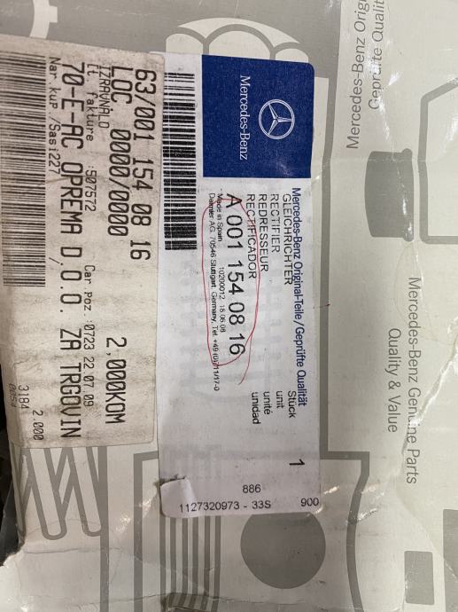 Prodajem A 001 154 08 16 MERCEDES-BENZ RECTIFIER, diodni most za alternator.