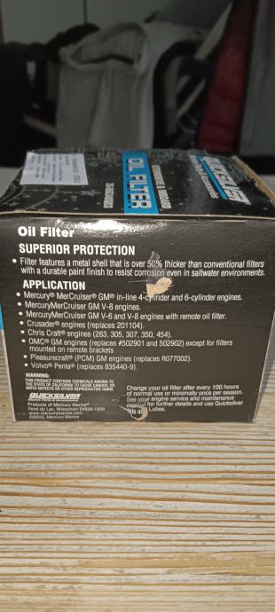 Prodajem novi filter ulja za Mercury/Mercruiser/GM za 4 i 6 cilindara redni, V-6 i V-8 motore.
