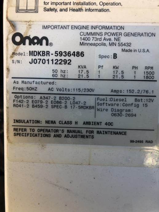 Onan 17,5 kw, monofazni, pogon Kubota V2204 , 4 cil, 1500 okr/min. G. 2007. Diesel.