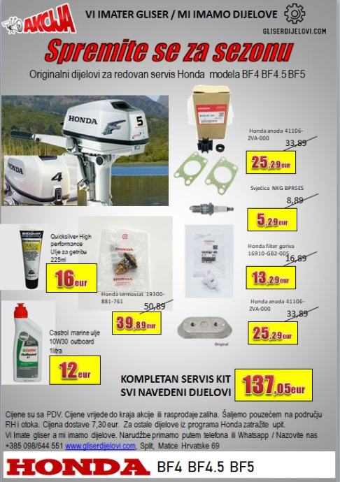 Honda kit za servis se sastoji od sljedećih dijelova