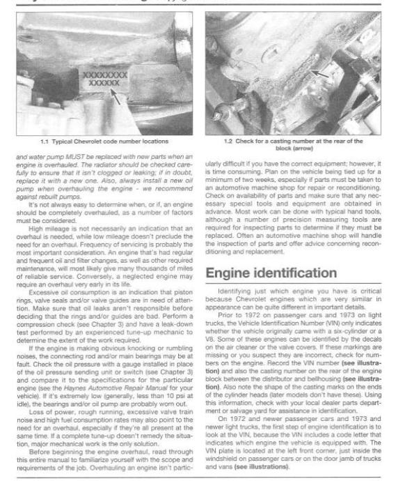 Uključuje 262, 265, 267, 283, 302, 305, 307, 327, 350, 396, 400, 402, 427 i 454 kubičnih V6 i V8 motora: