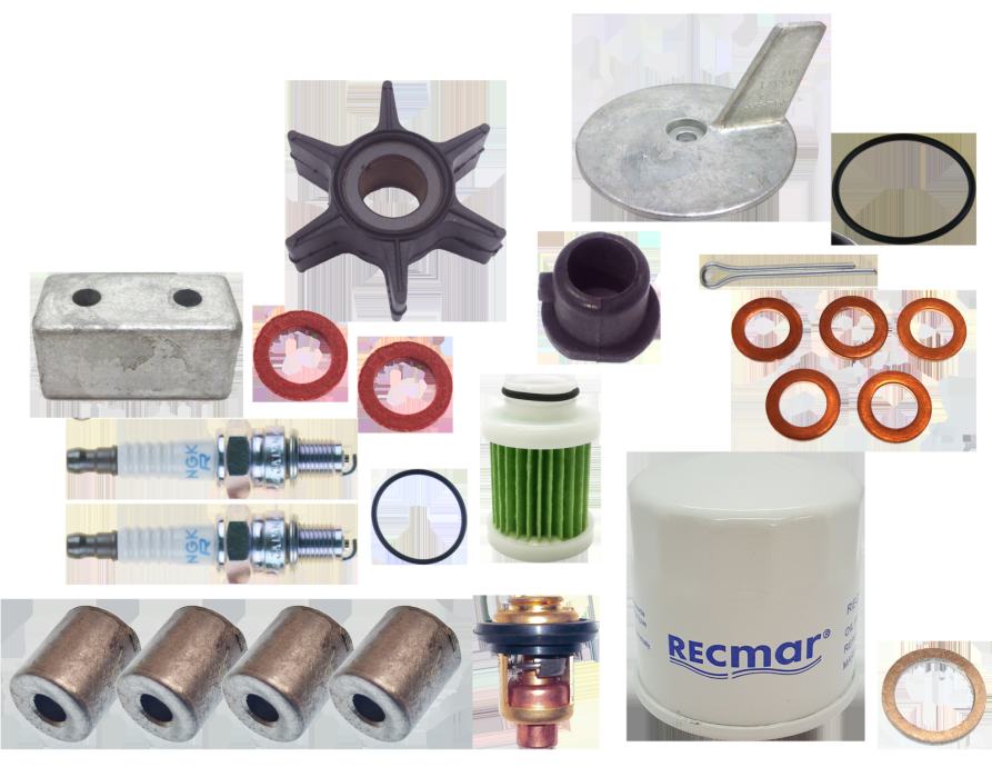 Anodes; impellers; spark plugs; oil, gas and air filters; belts; oil; exhaust elbow and manifolds; starters; alternators; joints; engine and drive components; engines; z-drives; propellers...