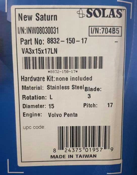 Prodajem nikad korišteni propeler SOLAS NEW SATURN od inoxa za brodski motor Volvo Penta.