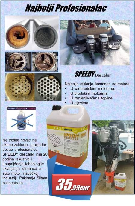 Speedy je visokoučinkovito sredstvo koje uklanja kamenac i naslage s površina izrađenih od aluminija, aluminijskih legura, cinka, mesinga, čelika, obojenih metala i plastike (PE, PVC), bez opasnosti od korozije jer ne sadrži klor.