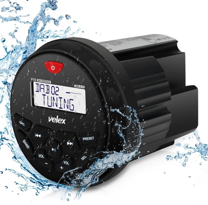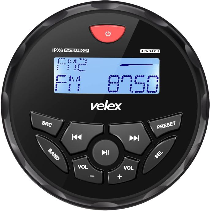 Kompletni Velex Marine Audio System idealan je za ugradnju na brodovima, gliserima i svim vanjskim prostorima gdje je potrebna visoka otpornost i vrhunska kvaliteta zvuka. Sustav uključuje stereo uređaj s podrškom za Bluetooth, USB, MP3, AM/FM te dva 6,5” bijela vodootporna zvučnika.