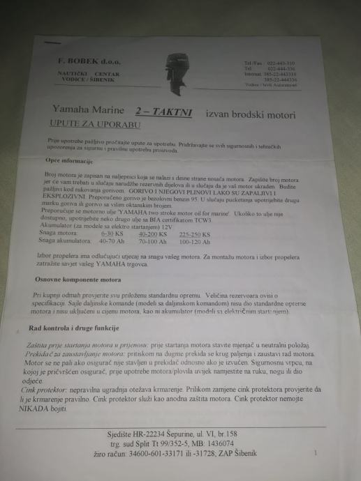 Prodaje se motor u Vodicama , vanbrodski, malo korišten Yamaha 20, srednje dužine. Korišten samo za godišnjeg odmora preko ljeta cca 3 mjeseca godišnje. Cijena po dogovoru.