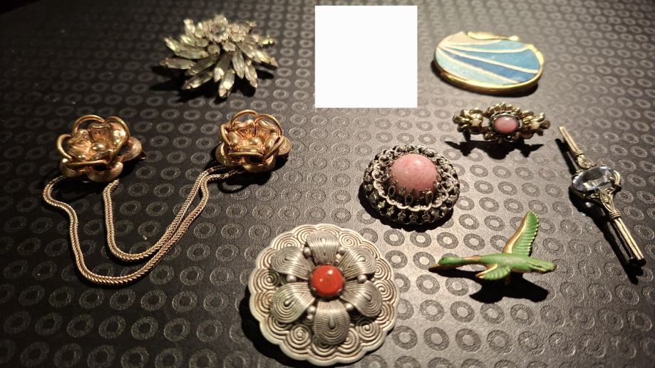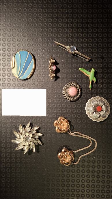 Prodajem kolekciju od 9 različitih rabljenih broševa raznih oblika i boja. Svaki broš ima jedinstveni dizajn, uključujući cvjetne motive, apstraktne oblike i broš - patka Idealni su za oživljavanje odjeće ili kao dodatak vašoj postojećoj kolekciji nakita.