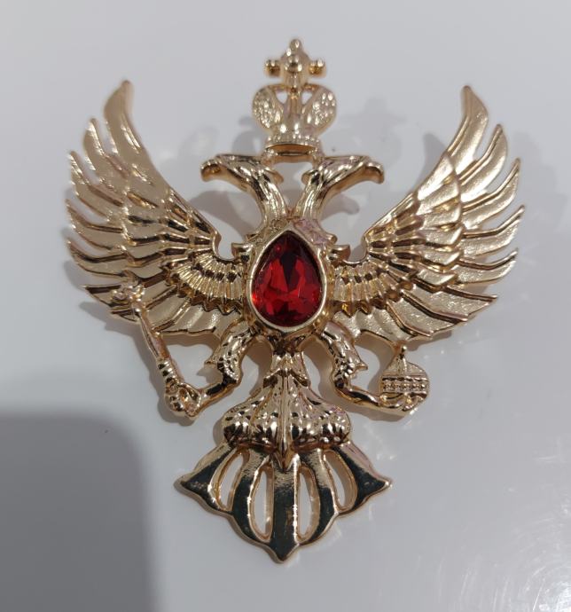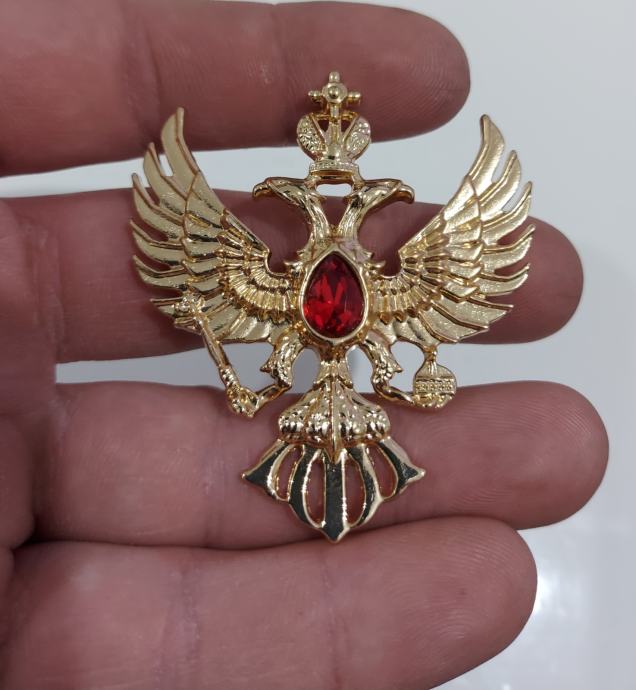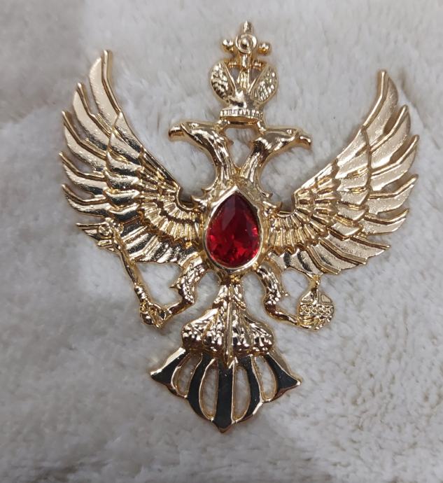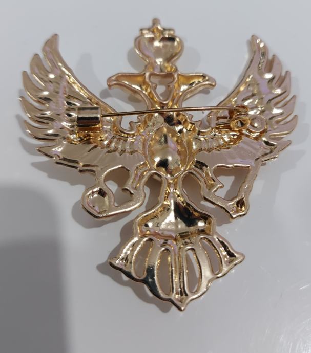 Broš dvoglavi orao, sa crvenim kamenom. Bižuterija.