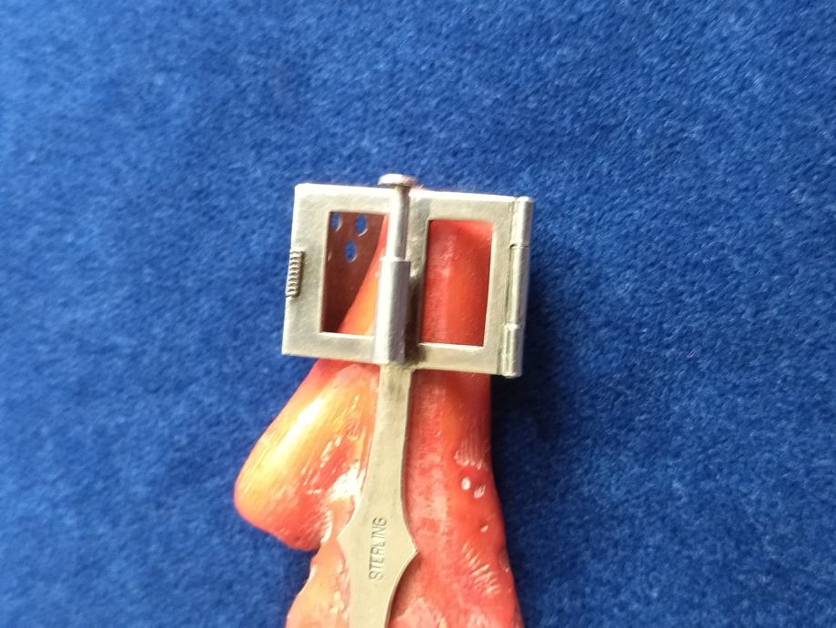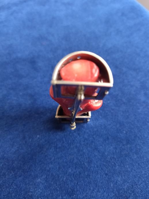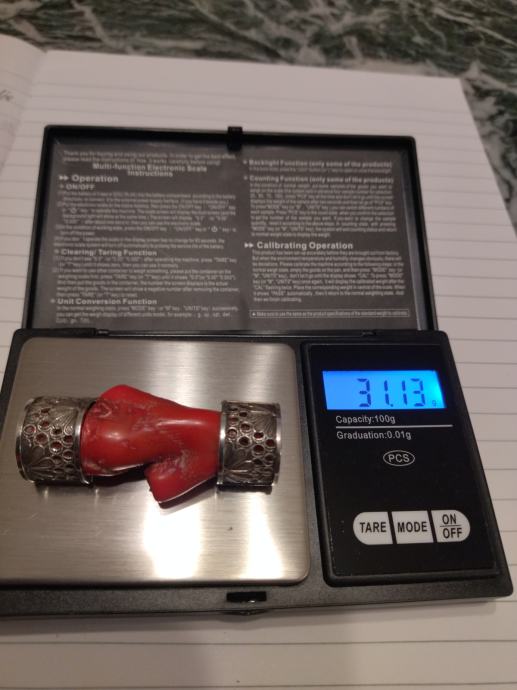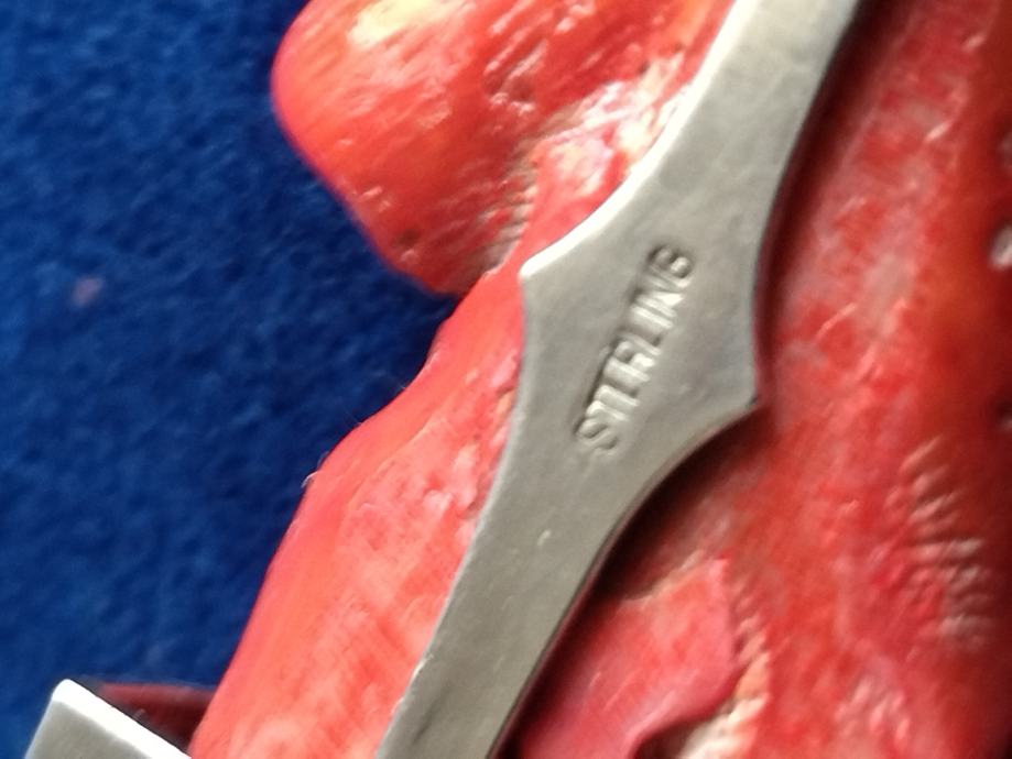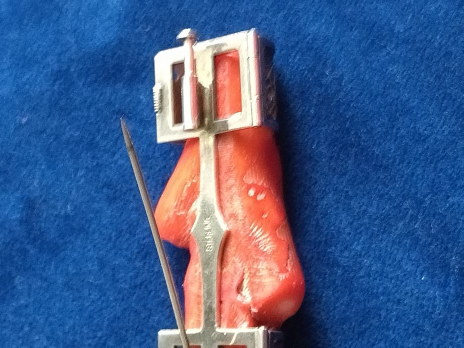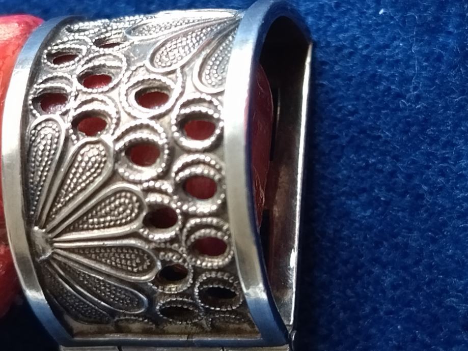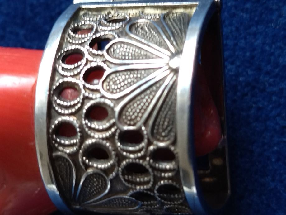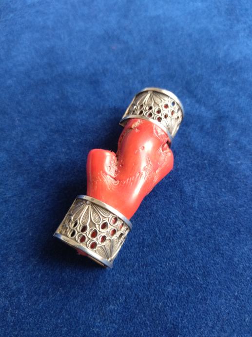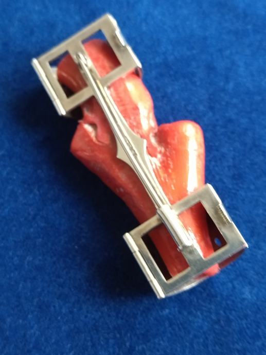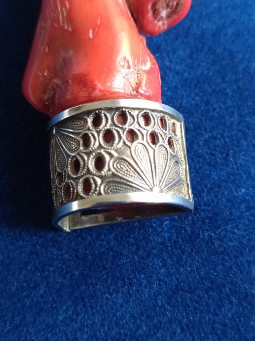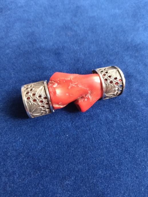 Stari broš zanimljivog dizajna. Dio grane crvenog koralja umetnut u dva filigranski obrađena dijela od srebra.Ukupna duljina broša 8 cm.