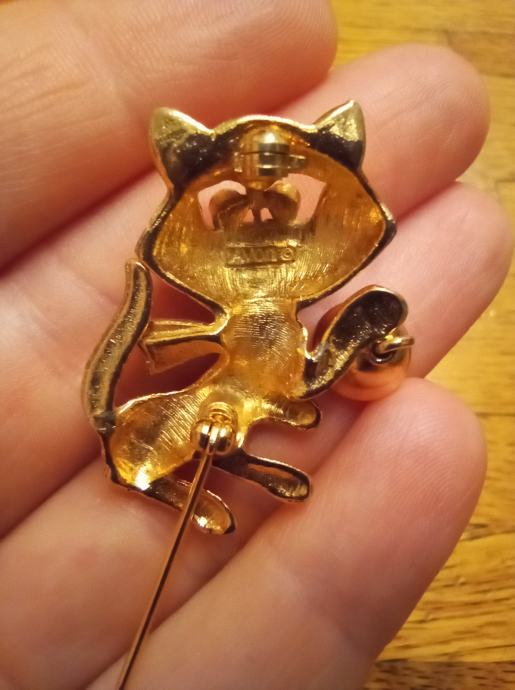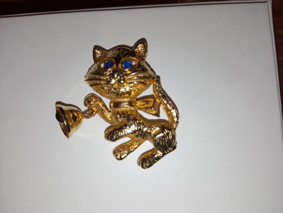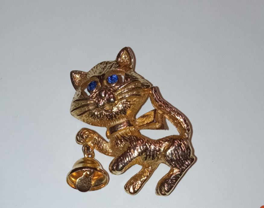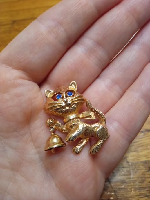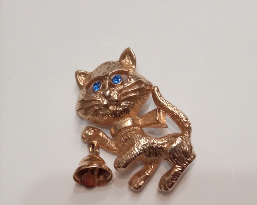 Prodajem broš mačak u zlatnoj boji s plavim očima i zvončićem.