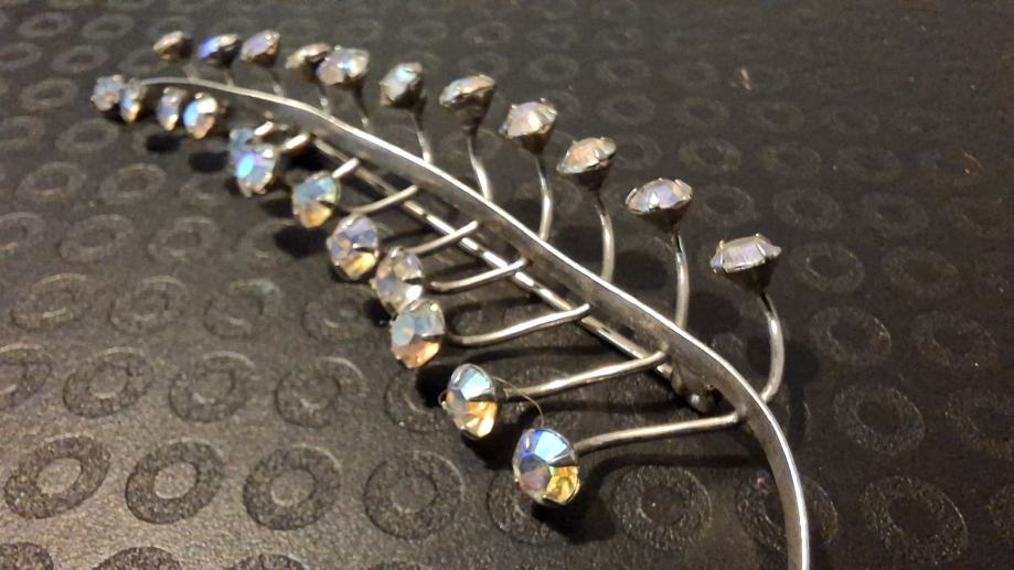 Vintage elegantni broš u obliku srebrne grančice, ukrašen sjajnim detaljima koji daju poseban šarm. Savršen modni dodatak koji će upotpuniti svaku odjevnu kombinaciju i dodati joj dozu sofisticiranosti. Izrađen od kvalitetnog materijala koji osigurava dugotrajnost i postojanost.