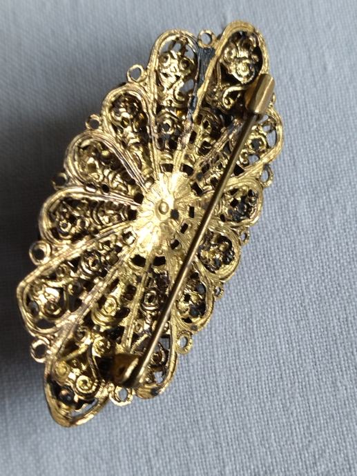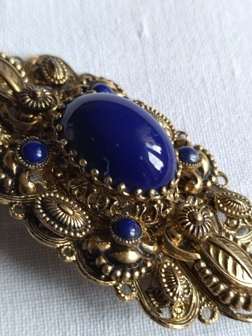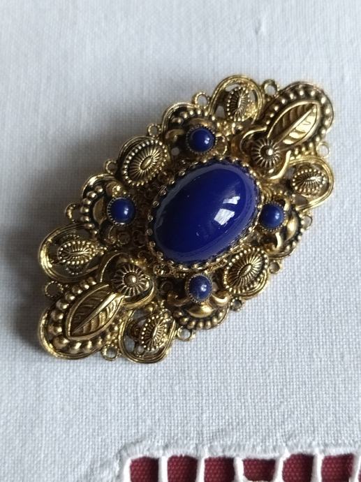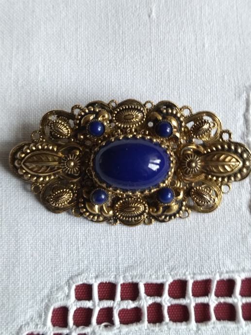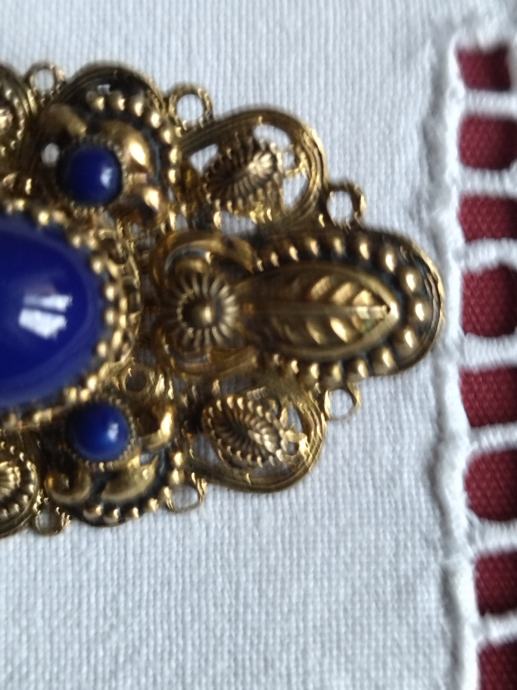 Stari tradicijski filigranski rad bogate izrade. Pozlaćeno srebro s jednim većim i četiri mala plava kamena.