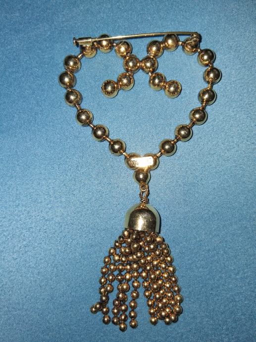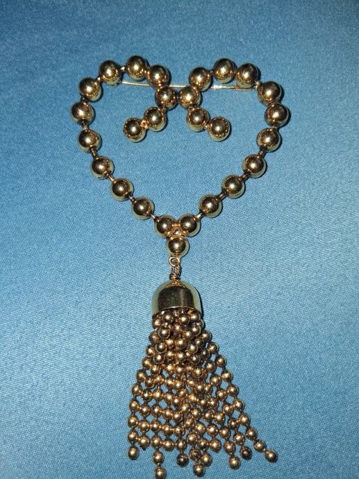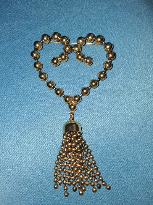 Prodajem prekrasan vintage broš u obliku srca s visecim privjeskom. Izrađen je od bižuterije u zlatnoj boji, s karakterističnim dizajnom u vintage stilu Moschino iz 80. godina prošlog stoljeća. Broš ima oblik srca od perli povezanih u nizu, s dekorativnim ukrašenim privjeskom koji visi ispod srca - elegantna kapa od metala iz koje se spušta resica sitnih perli.