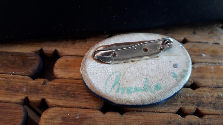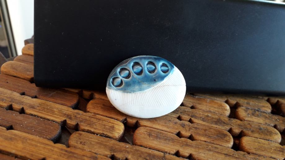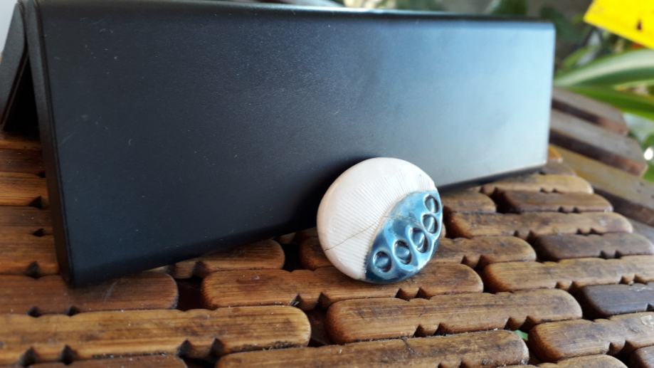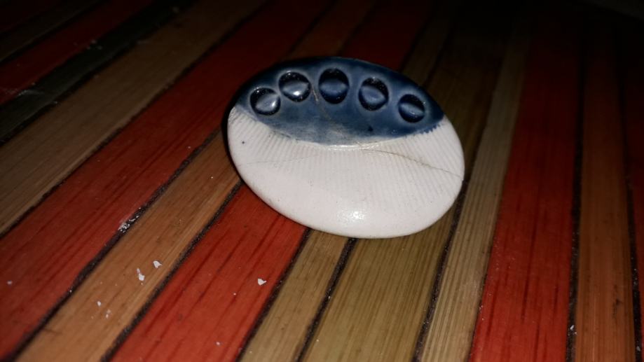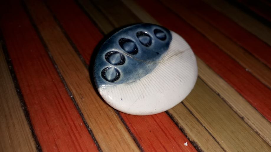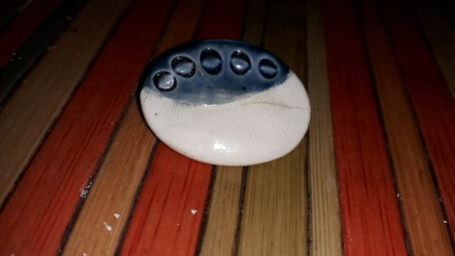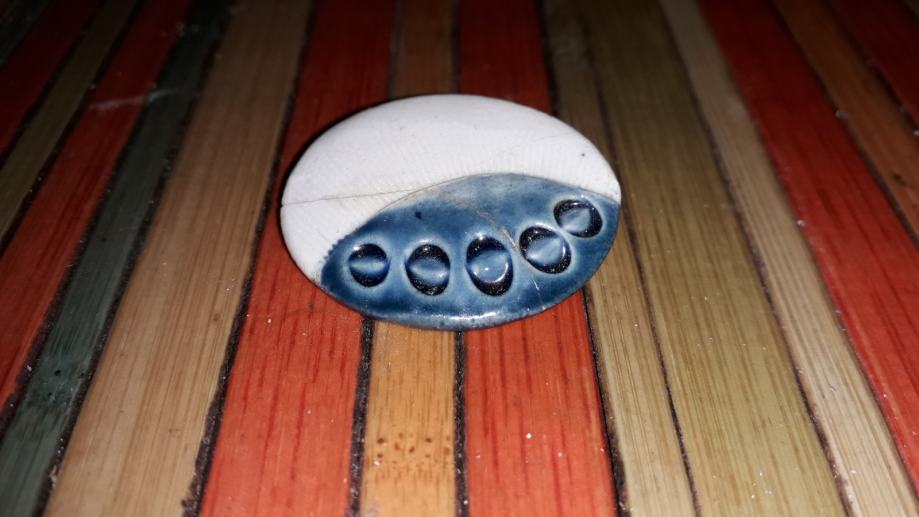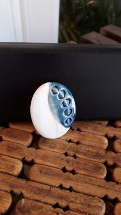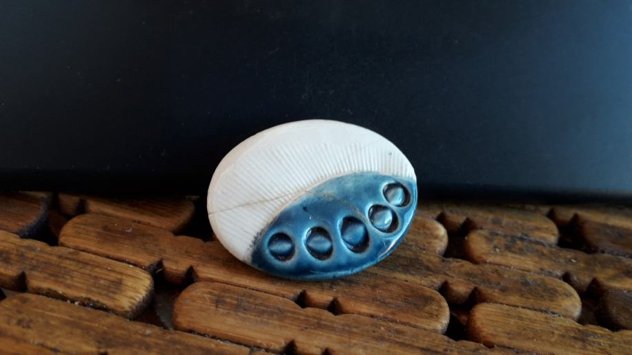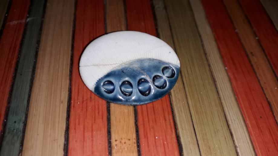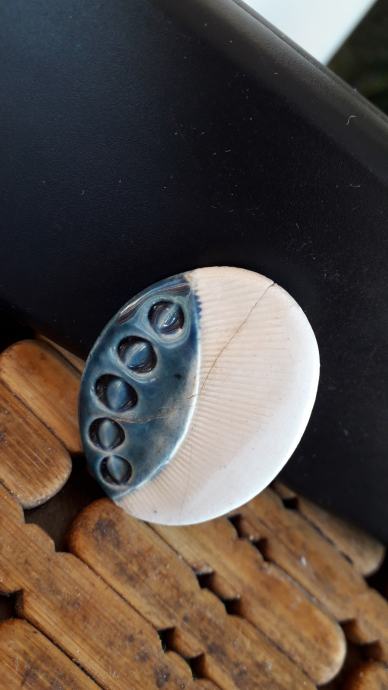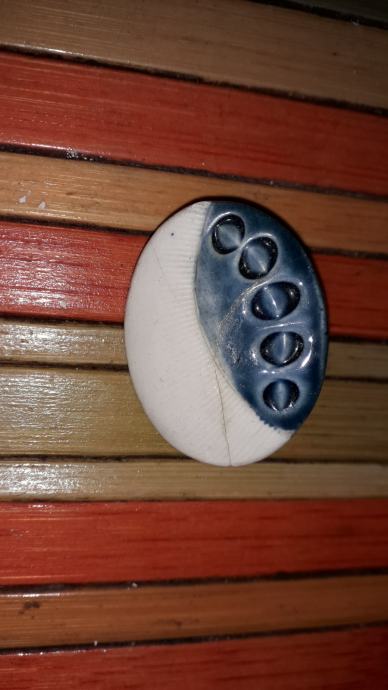 Ovalnog oblika, umjetnički rad, keramika, širina 5, visina 4,5 cm, kupljen u specijaliziranoj prodavaonici unikatnoga nakita, dizajnerski rad.