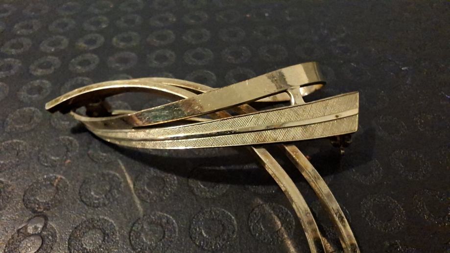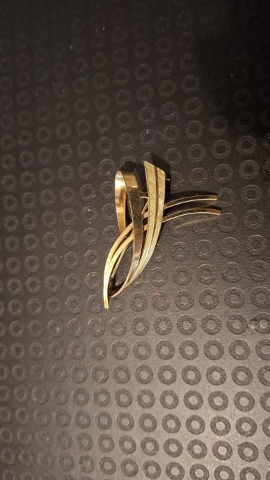 Elegantni pozlaćeni broš modernog dizajna s prepletenim linijama koji će dodati dašak elegancije svakom outfitu. Broš je u rabljenom stanju ali još uvijek prekrasnog sjaja. Savršen modni dodatak za svečane prilike ili kao ukras na sakou, šalu ili torbici.