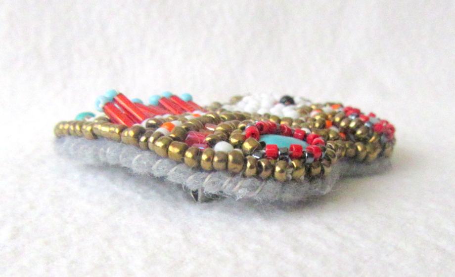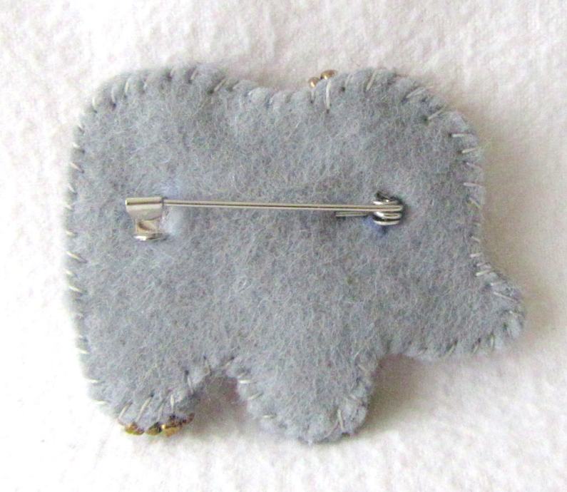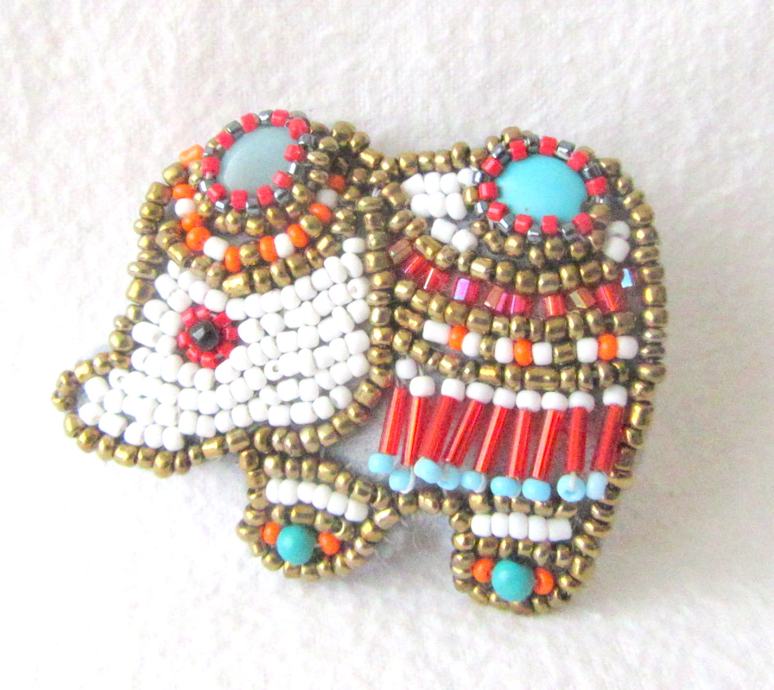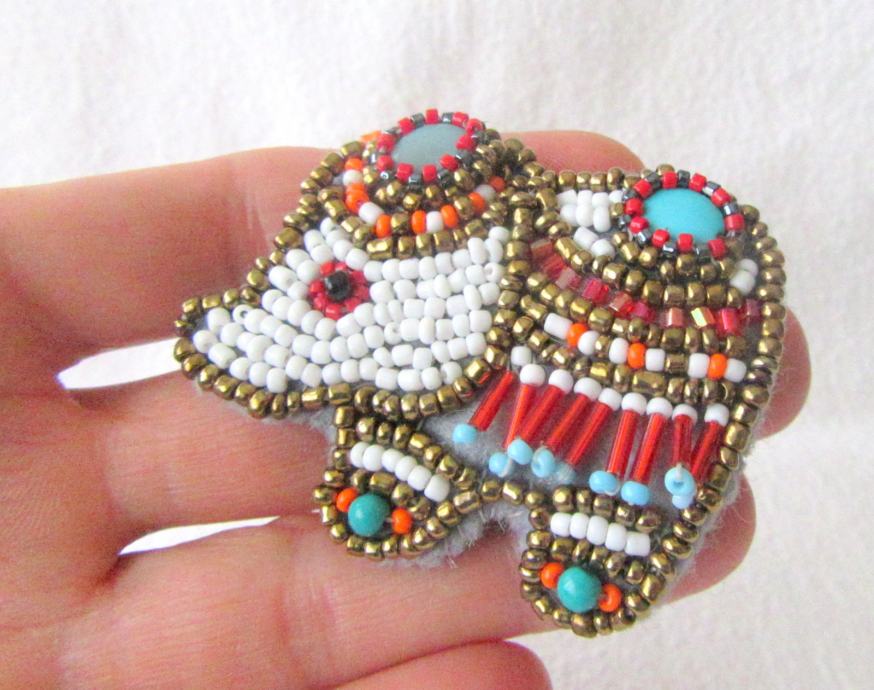 Broš u obliku slonića rađen embroidery tehnikom. Vrlo sitne staklene i tirkizne perlice šivane su na filc. Brošić je opšiven pamučnim koncem.