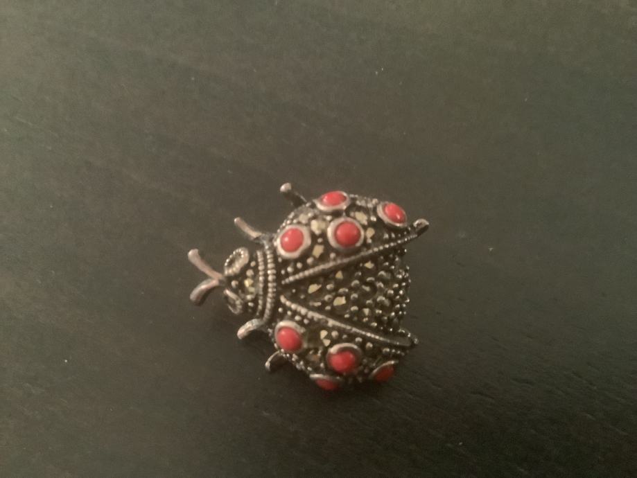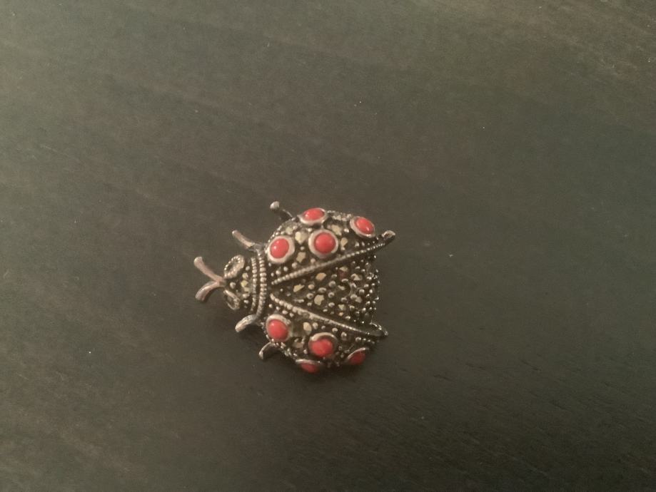 Bubamara srebro broš sa točkicama od crvenih koralja.