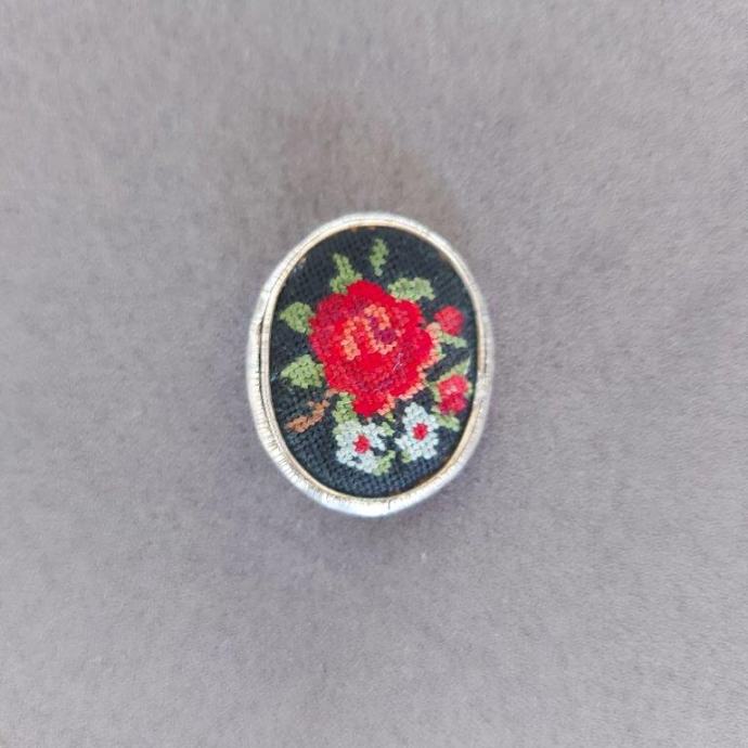 Starinski, ovalni broš, dimenzije 3,3 x 2,8 cm. Ručni rad, Petit Point vez motiv ruže u metalnom okviru.